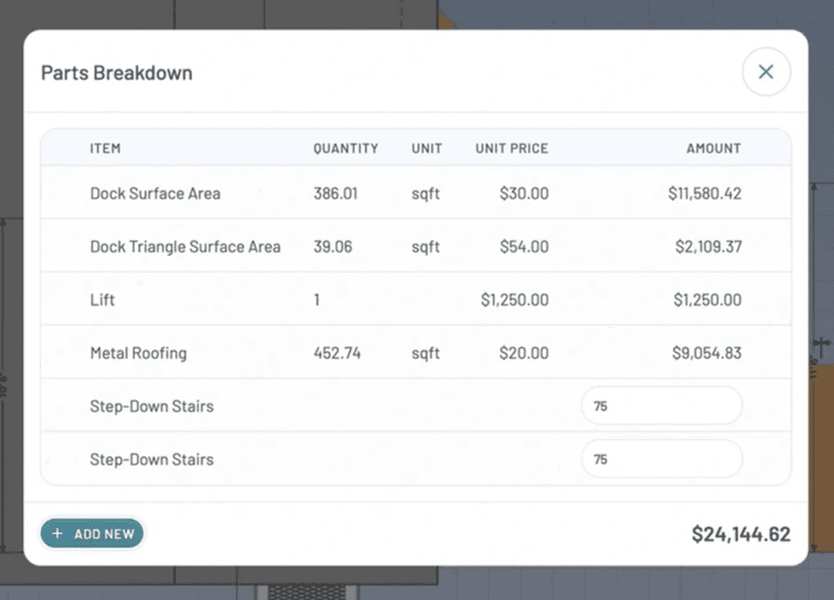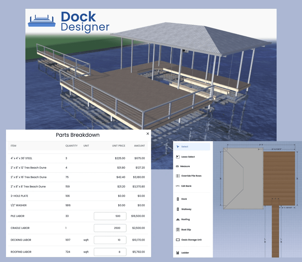 Our Dock Designer App has powerful tools to help you quickly represent your docks online and present professional estimates and proposals. This Software-as-a-Service (SaaS) solution is ready to use today to unlock your estimation and proposal process.