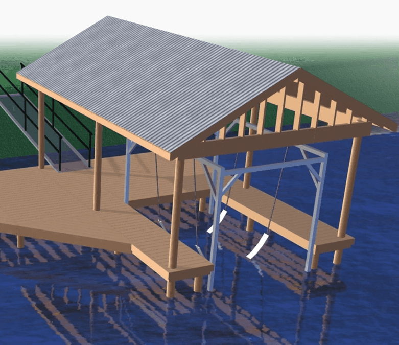 Design tool for boat docks featuring different roof styles and boat slips and lifts.